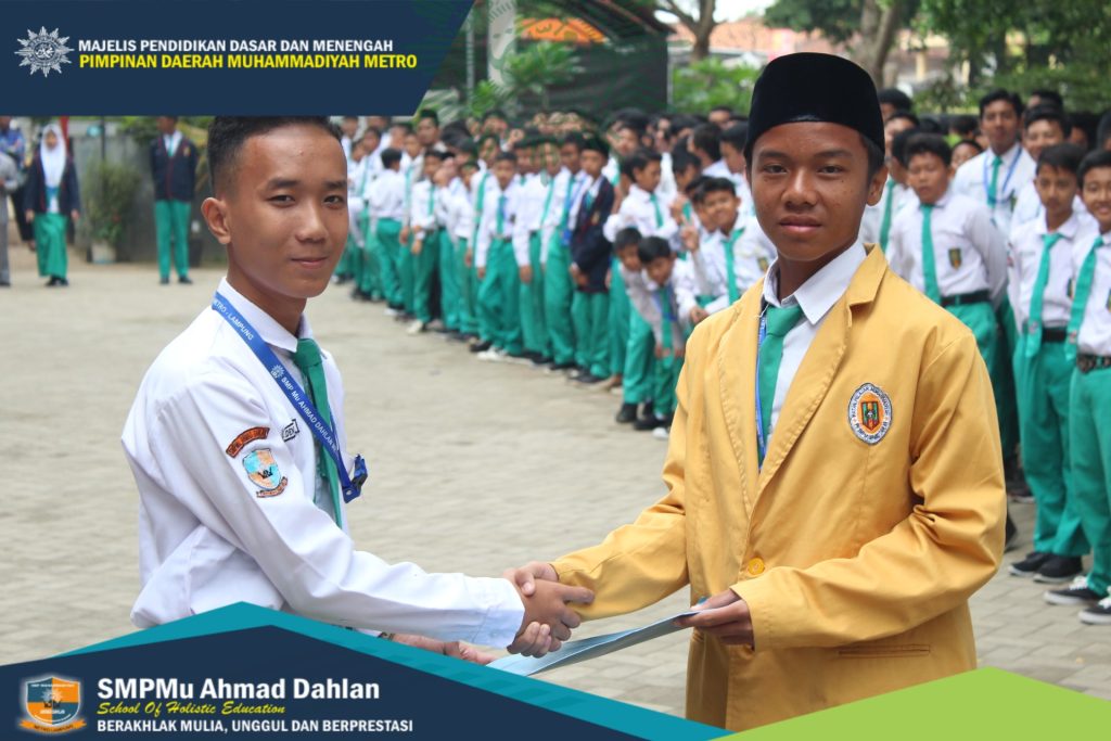 Metro, Lampung – (04/02/19) Suasana pagi cerah mengawali Prosesi Pelantikan PR IPM SMP Muhammadiyah Ahmad Dahlan. Prosesi pelantikan mulai terasa hikmat ketika dibacakan surat keputusan dari ipmawan Windra selaku sekbid kaderisasi PC IPM metro barat dan menyebut nama” pimpinan terpilih Kemudian d lanjutkan pembacaan janji kader yang dipandu oleh ipmawan Habib (ketua umum PC IPM Metro Barat ) di ikuti oleh seluruh pimpinan terpilih yang baru dan diakhiri dengan penyerahan almamater oleh ketua umum lama Ipmawan Denys Cahya Triska kepada ketua umum PR IPM terpilih periode 2019-2020 Ipmawan Gagah Puji Ramadhani.